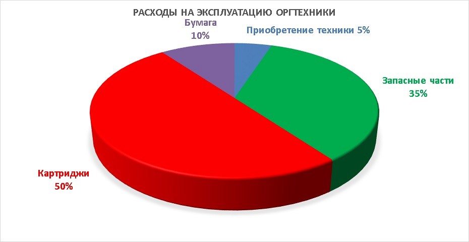 На диаграмме вы видите, что основные затраты при эксплуатации печатной техники – это картриджи и запасные части.
